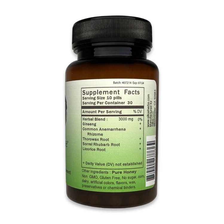 Thực phẩm bổ sung thảo dược của chúng tôi được làm từ mật ong tự nhiên làm chất kết dính. Mật ong có thể hỗ trợ phổi, ruột, lá lách và dạ dày; Nó hoạt động như một chất bảo quản tự nhiên có đặc tính kháng khuẩn và chữa lành. Không giống như các công ty thực phẩm bổ sung thảo dược khác sử dụng tinh bột, magiê và các chất hóa học khác làm chất kết dính cho thực phẩm bổ sung của họ, chúng tôi chỉ sử dụng 100% mật ong. Chúng tôi cũng tránh sử dụng viên nang thực vật vì chúng cần các thành phần hóa học để tạo thành hình dạng viên nang.