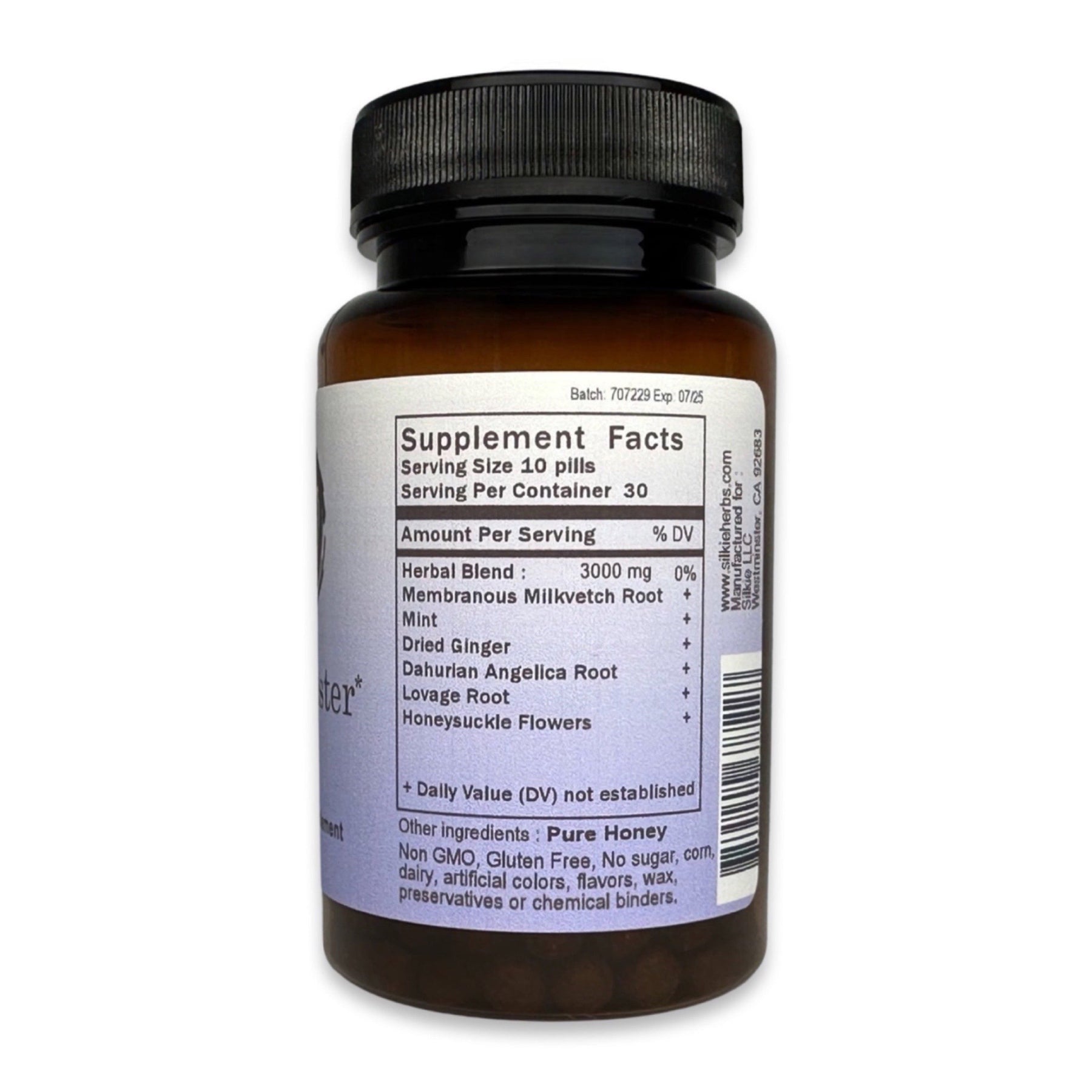 Thực phẩm bổ sung thảo dược của chúng tôi được làm từ mật ong tự nhiên làm chất kết dính. Mật ong có thể hỗ trợ phổi, ruột, lá lách và dạ dày; Nó hoạt động như một chất bảo quản tự nhiên có đặc tính kháng khuẩn và chữa lành. Không giống như các công ty thực phẩm bổ sung thảo dược khác sử dụng tinh bột, magiê và các chất hóa học khác làm chất kết dính cho thực phẩm bổ sung của họ, chúng tôi chỉ sử dụng 100% mật ong. Chúng tôi cũng tránh sử dụng viên nang thực vật vì chúng cần các thành phần hóa học để tạo thành hình dạng viên nang.